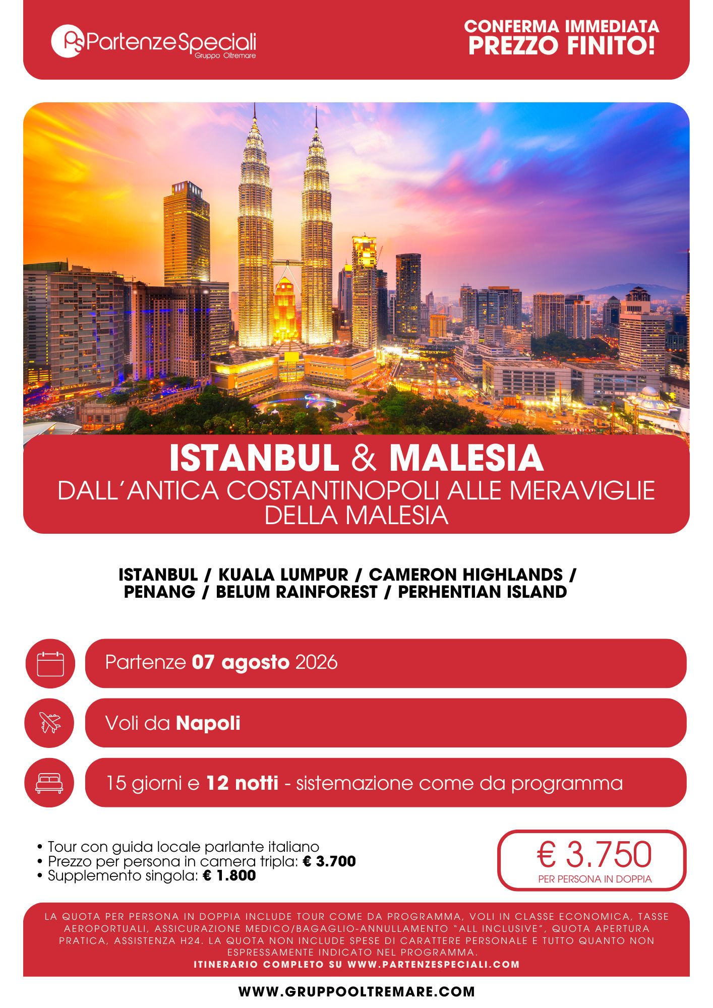 Dall’antica Costantinopoli alla meravigliosa Malesia, questa Partenza Speciale rappresenta un itinerario unico che unisce due mondi lontani e affascinanti: la magia senza tempo di Istanbul e la natura rigogliosa della Malesia. Un percorso pensato per chi desidera vivere un’esperienza ricca di storia, cultura, paesaggi spettacolari e relax tropicale, accompagnato da guide locali in italiano per una scoperta autentica e approfondita.