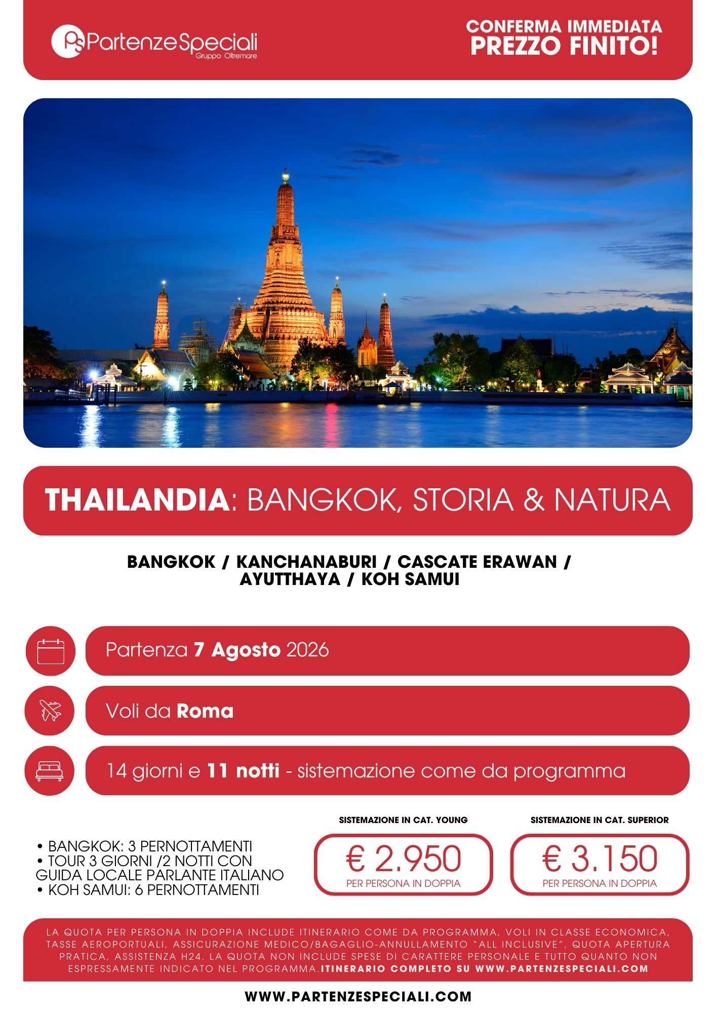 Viaggio con 3 notti a Bangkok, 3 notti di tour con tappe a Kanchanaburi, Cascate Erawan, Ayutthaya con guida in lingua italiana e 6 notti al mare a Koh Samui, con doppia soluzione alberghiera, di cui una dedicata ad una una clientela più giovane e attenta al rapporto prezzo-qualità.